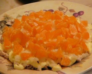 - Mandarine očistimo, narežemo i narežemo na luk.