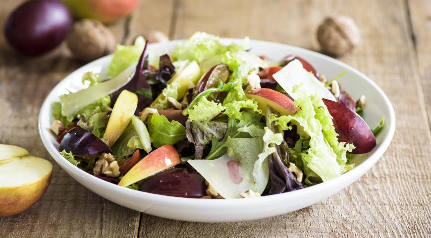 - U posudi za salatu pomiješajte preljev i salatu. Dodaj umiješajte paradajz, šljive i jabuke.