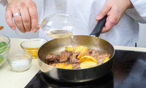 - Jabuke pospite šećerom, pričekajte da šećer karameliziran. Dodajte pileću jetru, sipajte konjak i isparavamo ga. Uklonite sve sa vatre.