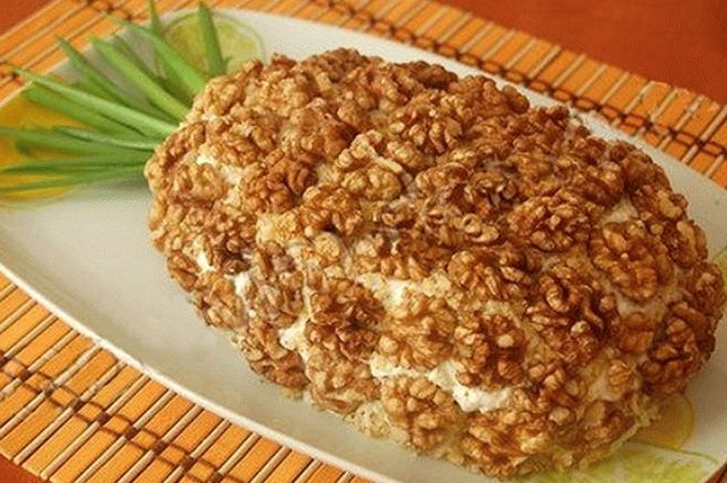- Tobogan za salatu pretvara se kao pola ananasa. Ananas rep napravite perje zelenog luka, raširite po cijeloj površini polovine koštica oraha.