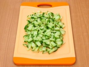 - Pripremite sastojke, meso narežite na trakice, višnje podijeliti na četiri dijela, krastavce narežite na trakice, rotkvice – tanke ploče.