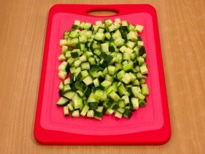 - Operite krastavce, oštrim nožem odrežite krajeve sa obe strane iseckajte na uredne kockice.