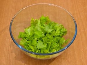 - Prethodno razdvojite zelenu salatu u velikoj posudi sa rukama oprati i osušiti papirnatim ručnicima.