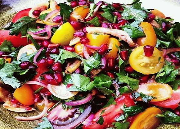 Na svečanom stolu obično je puno mesnih jela koja mogu upotpunite ovu ukusnu salatu sa šipakom i cherry rajčicama. On je instant, lagan i vrlo ukusan, priprema se jednostavno i brzo kod kuće neposredno prije dolaska gostiju. Salati daje pikantan okus preljev koji pravimo na osnovu limunovog soka.