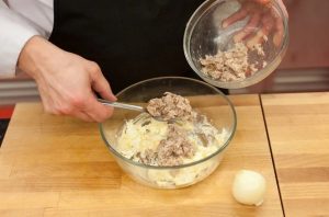 U drugoj posudi sitno izmiksajte krem sir, majonez sjeckani luk, dodajte pripremljenu skuša i dobro mešati.