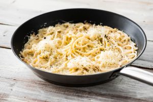 - Sitno nasjeckajte luk. Na srednjoj vatri zagrejte 1 kašiku. kašika maslinovo ulje u tavi. Dodajte luk, malo soli i kuhajte 2 minute. Izlijte kremu i vodu od paste. Dovedi prokuhajte i kuhajte 1 minutu. Uklonite posudu sa vatre, pomaknite špagete u sosu i izmešajte.