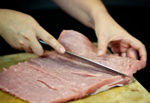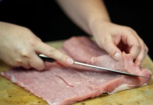 Operite i osušite komad svinjskog krila s papirom peškiri. Počinjemo rezati pripremljenu svinjetinu s dna dijelovi. Izrezali smo tanki dio do kraja.