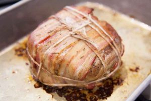Pečeni komad zamotajte u tanke trakice slanine, posolite sjeckani ruzmarin i da se slanina ne otvori kada se peče, vežemo s kulinarskom vrvicom.