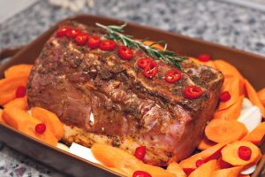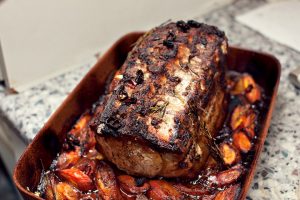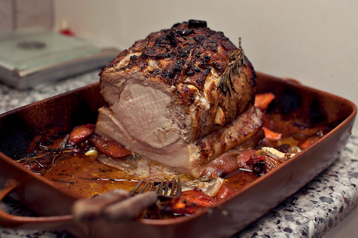 Pripremljeni komad s kožom dole stavljamo u oblik, oko stavite nasjeckani luk i mrkvu, nalijte 1 šolju vode. Na vrh svinjetine dodajte nasjeckanu papriku čilija, grančicu ruzmarina i poslati u prethodno zagrejanu rernu na 200 stepeni po 2,5 sati.