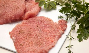 Svinjske komade peremo, sušimo papirnim peškirom, pobijte kroz lepljiv film, pospite solju i mlevenom paprikom.
