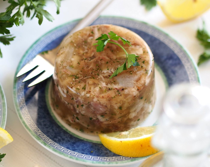 Ohlađeno meso sitno nasjeckajte, dodajte sjeckano meso kroz prešu belog luka, sitno seckanog peršuna i dobro izmešajte. Aromatizirano meso širimo u porcioniranim formama (savršeno male zaobljene posude), sipajte juhu, koja pokriva sve meso, pokriti poklopcima i poslati u hladnjak do kraja zadebljanje.