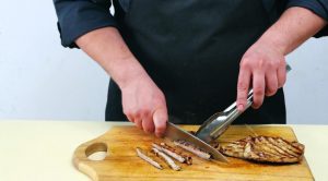 - Grijemo roštilj i na njemu pržimo meso, okrenimo ga jednom za 2 minuta. Podmažite meso sa obe strane preljevom i ostavite unutra odmarajte se 7 minuta.