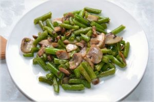 - Gljive narežite na kriške. Pržite gljive s pasuljem tava sa biljnim uljem.