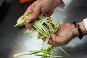 - Pripremite umak: 200 g maslinovog ulja pomiješajte u blenderu, 70 g limunovog soka, 30 g senzora Dijon i 3 g soli. Tikvice prebacite u posudu, posolite i začinite dobivenim umakom.