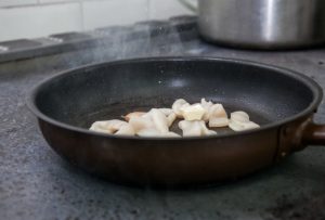 - Šporet šaljemo na šporet, zagrijavamo ga uz dodatak ulja i tamo sipajte češnjak, lagano propržite tako da beli luk dobije njegova aroma na ulje.