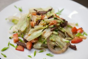 - Stavite salatu na tanjir sa brdom, pospite nasjeckanim zeleni luk.