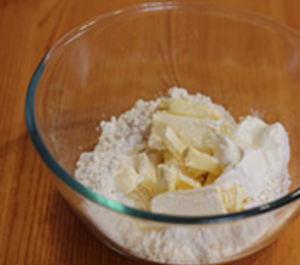 - Brašno pomešajte sa praškom za pecivo, dodajte kiselu pavlaku i pavlaku kriške putera. Zamijesite tijesto, prekrijte ga ljepljivim filmom i stavite u frižider.