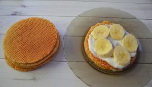 - Podmažite vaflice jogurtom, stavite kriške banane. Mi formiramo kolač i ukrasite. Stavite u frižider na nekoliko sati.